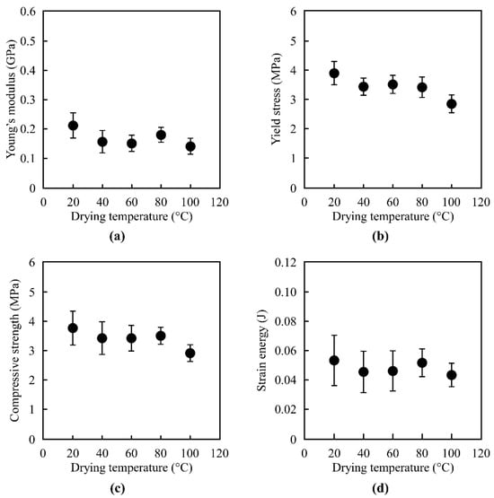 Influences of drying temperature on mechanical properties in the partial compression test. (a) Young’s modulus perpendicular to grain; (b) yield stress; (c) compressive strength; (d) strain energy. Each plot and bar shows the average values and the standard deviation, respectively. Filled circles in compressive strength and strain energy shown in (c,d) are calculated for the strain up to 5%.