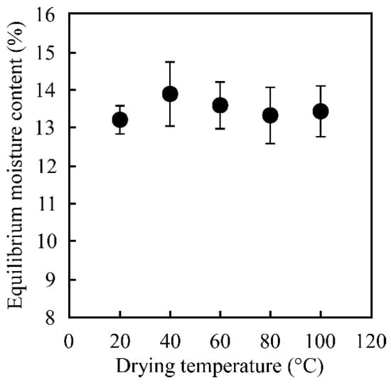 Influences of drying temperature on the equilibrium moisture content. Each plot and bar shows the average values and the standard deviation, respectively.