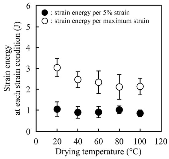 On the other hand, the strain energy results shown in Figure 3d never presented such apparent changes compared to other compressive properties. Figure 5 shows the typical result for the stress–strain curve. It was found that the yield point of most specimens was determined at strain more significant than 5%, and the strain energy shown in Figure 3d was mainly based on the mechanical behaviors of the elastic region. Then, two types of strain energy with different integrating ranges were compared, as shown in Figure 6. Each value of strain energy was divided by each strain level for comparison. It was found that strain energy based on the maximum strain showed a decreasing trend, while the strain energy evaluated up to 5% strain did not show significant changes. Higher drying temperatures might have changed the mechanical toughness of wood, especially in the plastic region. The wood dried at higher temperatures became more brittle in the direction perpendicular to the wood fiber.