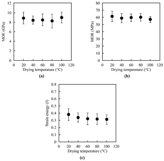 Influences of drying temperature on mechanical properties in the bending test. (a) MOE; (b) MOR; (c) strain energy. Each plot and bar shows the average values and the standard deviation, respectively.
