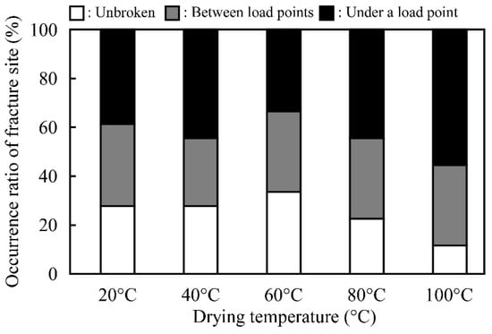 Some previous studies indicated that the mechanical properties of softwood species, not only the bending properties but also shear strength, were reduced by the heating even in the range of 100 to 110 °C []. Thus, the fracture site in the bending test was classified to confirm the effects of drying temperature on the resistance to shear force. Figure 8 shows the results of the occurrence ratio of the fracture site in the bending test. It should be noted that most specimens dried at 100 °C fractured during the bending test, and the fractures often occurred under the loading point. This suggests that heating temperatures close to 100 °C reduce the toughness of wood and its resistance to shear forces and that wood drying should be performed under appropriate temperatures.