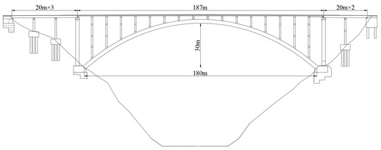 The proposed super-large bridge, Bridge A (see Figure 2), has a total span length of 287 m and a total length of 303 m, for which the aperture arrangement is 3 × 20 m + 187 m + 2 × 20 m. The main bridge is a reinforced concrete box arch bridge with a net span of 180 m, with a net rise-to-span ratio of 1/6 and an arch axis coefficient of 1.99. The construction scheme is cable suspension and cantilever pouring, with the main arch seat constructed in an open-cut form. The upper structure of the bridge approach comprises prestressed concrete T-beams, while the lower structure comprises column piers and pile foundations. The bridge abutment is a gravity U-shaped abutment, with an open-cut expanded foundation.