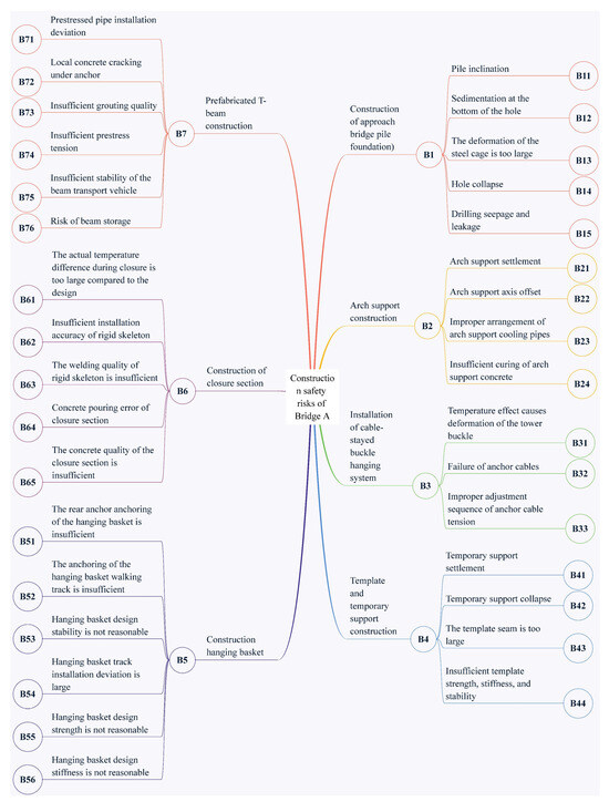 The Bayesian network structure diagram for Bridge A relies on the project’s structural system and the corresponding characteristics of the cantilever casting concrete arch bridge. Using the risk source identification method proposed in this paper, the corresponding Bayesian network was established, as shown in Figure 4.