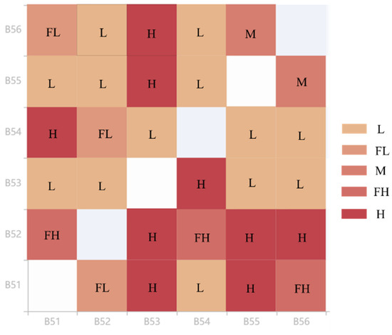 Firstly, a relative attribute judgment matrix for the sub-node risk sources was constructed. Based on the relative magnitudes of the seven levels in Table 1, the sub-node risk sources B51~B56 were evaluated. Based on the obtained results, the corresponding attribute judgment matrix was constructed, as shown in Figure 5.