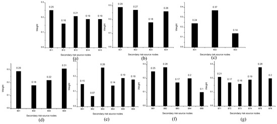 The conditional probabilities for the secondary risk sources corresponding to each primary risk source. (a–g) represent the primary risk source numbers B1–B7, respectively.