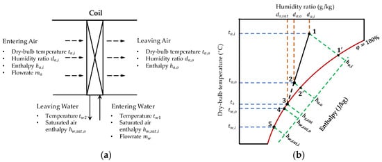 Lumped scheme of a cooling and dehumidifying coil: (a) Flow paths and inlet/outlet conditions; (b) Psychrometric process.