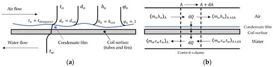 The schematic of a chilled-water cooling coil is shown in Figure 1. The inlet and outlet variables are listed in Table 1. In evaluating its thermal performance, a chilled-water coil can be normally treated as a water/air heat exchanger. A condensate film is on the coil’s surface for wet conditions, as shown in Figure 2a. For simplifying the coupled heat and mass transfer process, the following assumptions are usually made:
