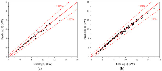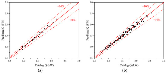 Based on the training and test datasets, the explicit calculation formula for each FCU model can be identified and tested. Take the models no. 200 and no. 1400, for example. Figure 3 compares the predicted and cataloged total cooling capacity of the FCU model no. 200 for the two sets, respectively. Figure 4 depicts the comparison for the model no. 1400. In the scatter plots, every black point represents an operating condition; the red solid and dotted lines refer to the relative error limits of 0%, −10%, and +10% to the catalog data. It can be observed that all points fall close to the 0% error line and between the ±10% error lines for both training and test sets. The total cooling capacity predicted by the proposed formula matches the catalog data well across all the operation conditions. It performs consistently from the training to the test datasets, indicating the formula’s accuracy and generalizability.