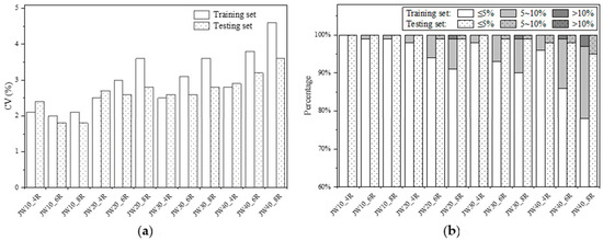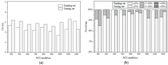 Table 3 lists the formulas’ identified parameters and overall accuracy indicators for all 9 FCU coils. Figure 5 depicts the CV values and relative error distribution of the prediction by the formulas. For the training sets, the CV values are about 2%, over 90% of points have a relative error of less than 5% (i.e., the average of is about 97%), and all points have a relative error of less than 10% (i.e., values). For the test sets, the CV and indicators degrade very slightly, i.e., the CV values are about 3%, and the average of is about 94%, but still, all points are within 10% error. The results indicate that the formula is robust for the series coils, from small nominal capacity to large capacity.