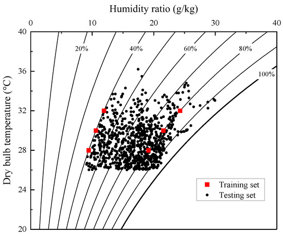 According to the recommended conditions for the empirical correlations of JW series coils, we selected 216 conditions, including 3 levels of inlet chilled water temperature, 3 levels of water flow rate, 4 levels of air flow rate, 3 levels of inlet air dry-bulb temperature, and 2 levels of inlet air relative humidity, to train the proposed formula. For the test dataset, we use an interpolation method to construct the new conditions of the inlet water temperatures, water flow rates, and airflow rates, and use the air temperature and humidity data from Beijing’s typical meteorological year (TMY) weather data [54,55] in the summer, from 1 May to 30 September, to increase the new conditions of the inlet air dry-bulb temperature and humidity, to represent the coils working over a wide operating range. To ensure the AHU coils operate in wet conditions, we selected the TMY weather data where the air dry-bulb is higher than 26 °C and the air humidity is higher than 40%, i.e., 815 points. Table 5 details the training and test sets for validating the formula for AHU coils. Figure 6 depicts the inlet air conditions for the training and test sets. Overall, the test set has 500 times more data than the training set.