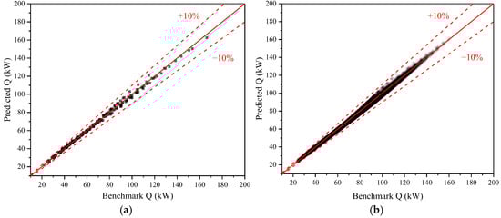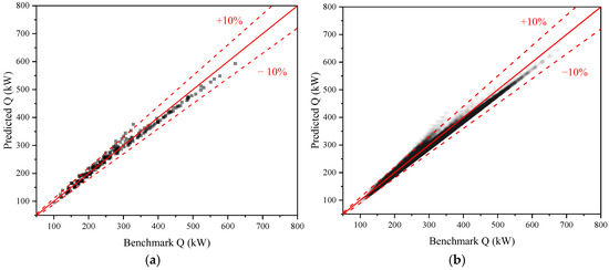 Predicted vs. benchmark total cooling capacity of AHU JW10_4R: (a) Training set; (b) Test set.