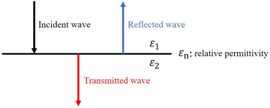 As can be seen from Formula (1), the propagation speed of an electromagnetic wave in concrete is mainly determined by the relative dielectric constant of the medium. During the propagation of electromagnetic waves, reflected and transmitted waves are generated on interfaces with different electromagnetic properties, as shown in Figure 2. The reflection and transmission follow the law of reflection and transmission, and the reflected energy of the electromagnetic wave signal is determined by the reflectivity.