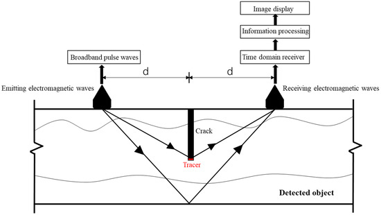 The tracer electromagnetic method is an emerging technique in concrete crack depth detection. This new method is based on a combination of indicator and ground-penetrating radar, utilizing the indicator to diffuse to the bottom of the crack and then mapping out the position of the air–indicator interface through electromagnetic waves, thus visually displaying the crack depth information [26,27]. This paper proposes a new method based on the combination of tracer and hand-held radar to better complete this task. Its main procedures firstly include spreading tracer diffusion to the bottom of the crack propagation, and then mapping the air–indicator interface position using electromagnetic waves to visualize the crack depth information. Compared with the traditional crack detection technology, the tracer electromagnetic method is not limited by the detection distance and coupling agent viscosity, and does not require point-by-point detection; the equipment is easy to operate, and the detection results are highly accurate [28,29].