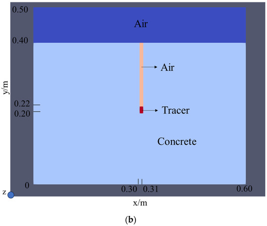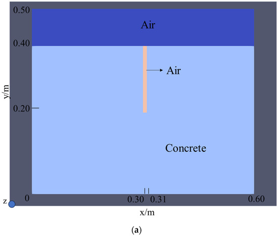 A vertical crack model is shown in Figure 4. The media of the model in Figure 4a are air, vertical crack, and concrete, in order from top to bottom, where the crack is filled with air. The media of the model in Figure 4b are air, crack, and concrete, in order from top to bottom, where the upper part inside the crack is air and the lower part is the indicator. The model is 0.6 m long (x-axis direction), 0.5 m high (y-axis direction), and 0.001 m wide (z-axis direction). The crack is 0.2 m high and 0.01 m wide, and the indicator is 0.02 m high and 0.01 m wide. In order to attenuate or eliminate the influence of boundary reflections and at the same time to improve the computational efficiency, an electromagnetic wave absorbing layer (Perfectly Matched Layer, PML) is set up at the boundary, and the mesh has a side length of 0.001 m. The analog excitation source is selected as 1600 MHz Ricker, and the signal receiver is parallel to the emission source and located at the right side of the grid at 0.01 m. In the simulation process, the emission source and the signal receiver complete the detection scanning from left to right along the outer boundary of the air medium. The electrical parameters of the medium are shown in Table 2.