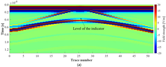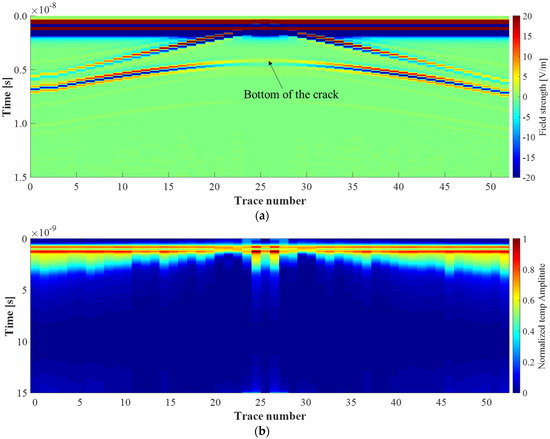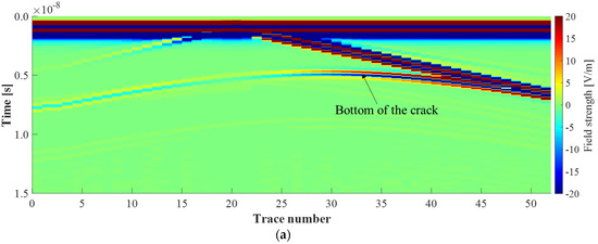 The orthogonal results shown in Figure 6a illustrate that the indicator is present at the bottom of the vertical crack. Here, the amplitude of the reflected signal generated from the indicator level is enhanced and the phase is reversed, compared with that without the indicator in the crack. The bottom of the crack is difficult to recognize due to serious attenuation of the electromagnetic wave when crossing the indicator.