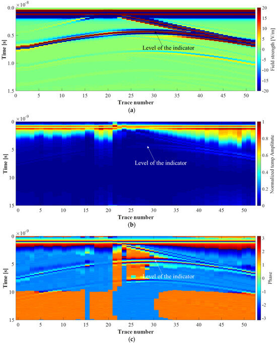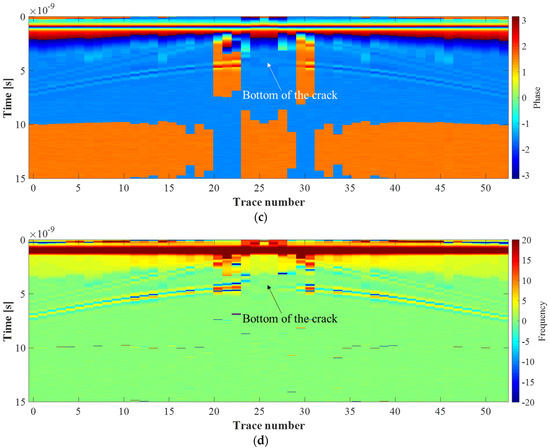 The instantaneous phase is opposite to the instantaneous amplitude information, and only the phase information in the radar detection result is retained, while amplitude information is discarded, so that even weak signals can be displayed well. The instantaneous phases of vertical cracks without the indicator and vertical cracks containing the indicator are shown in Figure 5c and Figure 6c, respectively. As can be seen from the figures, the multiple reflected waves generated by the crack and the reflected waves generated at the bottom end of the crack are clearly shown, the location of the bottom end of the crack can be inferred, and there is a clear difference between the reflected signals generated in the indicator-containing crack and the waves generated in the open position of the crack, making them easier to differentiate. Compared with the unfilled crack, the reflected wave’s phase in the indicator-filled crack is reversed by 180°.