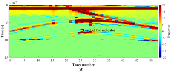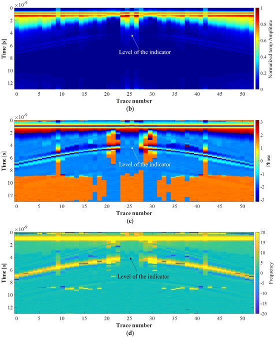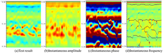 The instantaneous amplitude is shown in Figure 16b, and the hyperbolic reflection signal generated at 12 cm depth is very obvious. The instantaneous phase is shown in Figure 16c, and there is an obvious anomaly in the same-phase axis at a depth of 12 cm. The range of the anomaly can be clearly inferred from the anomalous region of the same-phase axis, which has been reversed by 180° and is inferred to contain the indicator in this location. The instantaneous frequency is shown in Figure 16d, and there is an obvious frequency division interface at the position of 12 cm depth. Additionally, there is a low-frequency reflection region at this location, which is consistent with the presence of indicator at this location. Due to the small amount of indicator in the upper part of the crack bottom, the actual detection height is slightly larger than the actual crack depth.