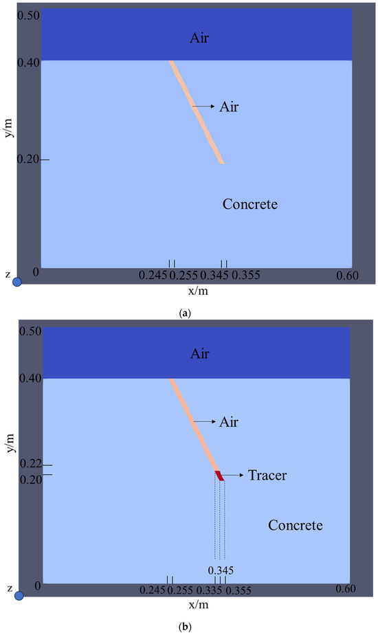 The diagonal crack model is shown in Figure 7. The media of the model in Figure 7a are air, diagonal crack, and concrete in order from top to bottom, where the crack is filled with air. The media of the model in Figure 7b are air, diagonal crack, and concrete in order from top to bottom, where the upper part of the crack is filled with air and the lower part is filled with the indicator. The model is 0.6 m long (x-axis direction), 0.5 m high (y-axis direction), and 0.001 m wide (z-axis direction). The crack is 0.2 m high and 0.01 m wide. The indicator is 0.2 m high and 0.01 m wide. The boundary setting, simulated excitation source, and detection method are the same as in the Chapter 3.1 calculations. The electrical parameters of the relevant medium are shown in Table 2.