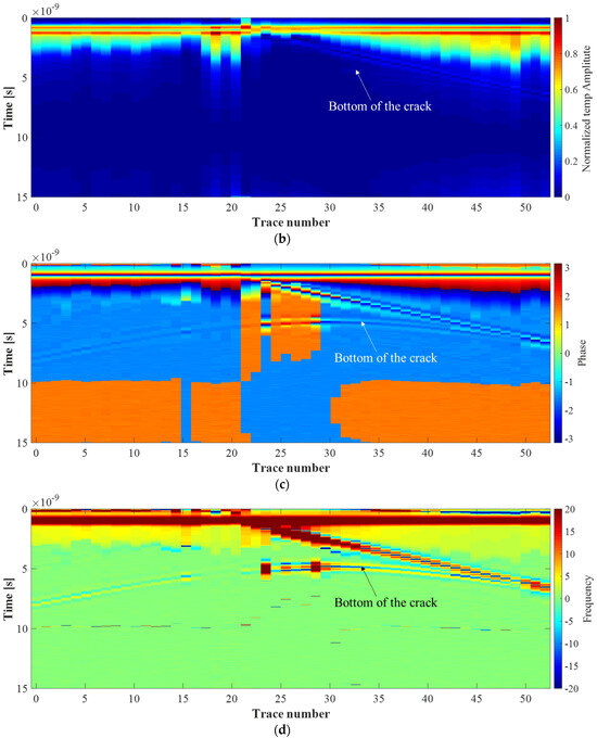 In order to further precisely identify the positional reflection at the bottom of the crack, the radar detection results were analyzed by complex signal analysis. The results are as follows.