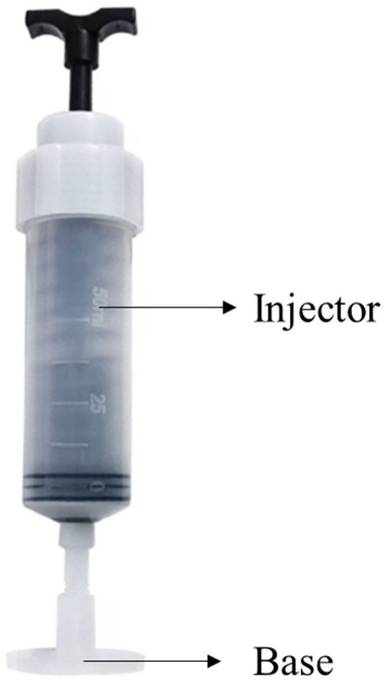 The indicator injector used in this test is shown in Figure 12. The filling process was automatic low-pressure filling. The indicator injector consisted of two parts: the injector and the base. The role of the injector was to extract, store, and output the indicator, and the base contained an inlet hole connecting the crack and the output port of the injector.