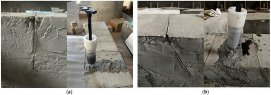 Clean the structure’s surface of dust and impurities in the cracks before testing, place two bases on the cracks on the structure’s top surface, seal the top surface of the structure’s cracks with epoxy cement on both sides, and fix the grouting bases.