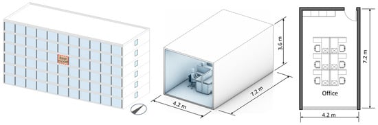 The study was conducted in Jinan, a city in northern China located at 36°40′ N and 117°00′ E. The city belongs to warm temperate semi-humid monsoon climate with hot, rainy summers and cold, dry winters []. With the influence of solar radiation, general atmospheric circulation, and the geographical environment, the peak dry-bulb temperature in Jinan is as high as 42 °C, and the coldest temperature in winter is around −19 °C. This results in global horizontal irradiance, in particular, direct normal irradiance, mostly from the south. Therefore, when designing adaptive façades for buildings, it is necessary to weigh multiple performance objectives, such as warmth in winter and coolness in summer. A typical office building in the city of Jinan, facing south, was selected as a case study. The mid-floor office unit of the building was selected for parametric modeling, with spatial dimensions of 4.2 m × 7.2 m × 3.6 m and a window-to-wall ratio of 0.95 (Figure 2). The open-source Ladybug tools provided by the Grasshopper platform were used to construct the indoor daylighting model, the quality of view model, the solar radiation model, and the photovoltaic power generation model, respectively. Ladybug tools are proven simulation tools that have been widely used [,]. The workflow utilizes EnergyPlus Weather Data meteorological data provided by the U.S. Department of Energy.