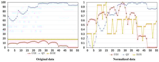 When analyzing the performance characteristics of the building envelope, it is necessary to ensure the precision of the division of the functional attributes of the building envelope and to consider the dimensional design of the adaptive modular units. Based on the parametric model created in Section 3.1, the building envelope was divided into 56 individual unit module windows, each measuring 0.5 × 0.5 m. Each unit module window was assigned a serial number ranging from 0 to 55. The three building performance models from Section 3.1.1, Section 3.1.2 and Section 3.1.3 were integrated, and the performance indicators UDI, QV, and BSR were simulated for each unit module window in turn. It is worth noting that during the simulation and analysis of the indoor view performance, the field of view factor needed to be set to 0 due to the small size of each unit module window. A field of view factor greater than 0 at a test point indicates that the window view is visible at that location; otherwise, it is not. To avoid the influence of data types of different dimensions and magnitudes on the clustering algorithm and to ensure consistency, the performance indicators of the simulation calculation were normalized. The results are shown in Figure 3, and the normalized equation is as follows: