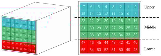 K-means is an unsupervised clustering algorithm that groups data objects with the same characteristics through similarity calculations among data objects. The algorithm has been widely used, with a fast clustering speed and a good clustering effect []. The algorithm divides the data into k clusters based on n given sets of data objects, each containing at least one data object, and each data object can only belong to one cluster. This study uses the K-means clustering algorithm to perform a cluster analysis of the normalized unit module performance characteristic values, with the K value set to 3. As depicted in Figure 4, the building envelope is segmented into three parts of the region—upper, middle, and lower—through cluster analysis.