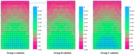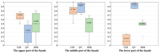 The purpose of Figure 5 is to further investigate the results of building envelope division and extract the performance characteristic values of each region unit module for a box diagram analysis. Firstly, the average size of the performance indicators UDI, QV, and BSR in the upper part of the building envelope is ranked as follows: UDI (0.658) > BSR (0.506) > QV (0.281). This ranking indicates that indoor daylighting and thermal performance are the main functions of this part. When designing adaptive façades for this part, it is essential to focus on enhancing indoor daylighting and reducing the obstruction of solar radiation energy. Secondly, the average size of the performance indicators UDI, QV, and BSR in the middle part of the building envelope is ranked as follows: QV (0.893) > UDI (0.793) > BSR (0.488). This ranking indicates that the indoor view and daylighting performance are the main functions of this part. In designing the adaptive façade for this part, emphasis should be placed on reducing visual field obstructions and improving daylighting performance. Additionally, the average size of the performance indicators UDI, QV, and BSR for the lower part of the building envelope is ranked as follows: QV (0.920) > BSR (0.465) > UDI (0.119). This ranking indicates that the indoor view and thermal performance are the main functions of this part. When designing adaptive façades, focusing on reducing obstructions to the visual field and maximizing BSR is necessary. After a comprehensive analysis of the performance characteristic values of the upper, middle, and lower parts of the building envelope, it was found that the upper and middle parts significantly impact UDI. Furthermore, the building envelope’s middle and lower parts significantly impact QV. The influence of BSR on the three parts of the building envelope is almost equivalent.