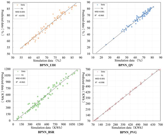 According to the R2 and MSE of the predicted value of the BPNN model and the simulated value, it was determined whether the predictive model could accurately reflect the mapping relationship between the adaptive façade design parameters and the building performance objectives. R2 signifies the proportion of the simulated values that can be explained by the predicted values, reflecting the degree of fit between the predicted and simulated values. A higher absolute value of R2, closer to 1, indicates a better fit. Generally, when the R2 is higher than 0.93, the predicted values output from the BPNN model are considered to fit well with the simulated values. The MSE represents the error between the predicted and simulated values, with a smaller value indicating a more accurate description of the mapping relationship. The validation results of the four performance prediction models, as depicted in Figure 6, show that the MSE and R2 for each model meet the accuracy requirements, rendering them suitable for performance prediction. The hyperparameter settings of each prediction model are detailed in Table 5.