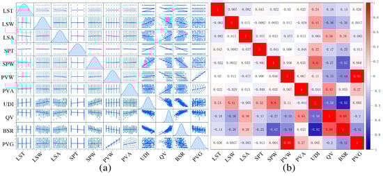 Bivariate scatter matrix (a) and Pearson’s correlation coefficient matrix (b).