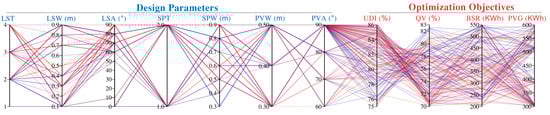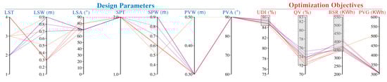 Since some of the adaptive façade design parameter combinations result in substandard building performance, screening criteria were established for the four performance objectives to enhance the efficiency of finding the Pareto front solution using the multi-objective optimization algorithm. The set criteria are as follows: UDI > 75%, QV > 70%, BSR > 200 KWh, and PVG > 200 KWh. After 500 generations of optimization iterations, the four performance objectives gradually converge and stabilize. The last generation of the Pareto front solution set was selected, and duplicate data were deleted, resulting in 136 groups of valid Pareto front solution sets. Visual decision-making for the Pareto front solution sets was conducted through the Design Explorer2 platform. The parallel coordinates plot in Figure 8 displays 136 groups of Pareto front solutions, with each line segment representing a solution. The parallel coordinate plots reveal the distribution range of the four performance optimization objectives. Specifically, the UDI distribution ranges from 75.14% to 86.30%, the QV distribution ranges from 70.04% to 82.59%, and the BSR distribution ranges from 203.60 to 549.80 KWh. The PVG distribution spans from 300.00 to 599.00 KWh.