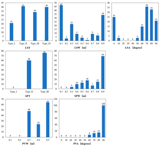 Secondly, regarding the correlation analysis between the adaptive façade design parameters and the indoor view performance, the correlations between QV and LST, LSW, and LSA are −0.18, −0.36, and 0.36, respectively, with LSW and LSA showing a moderately correlated relationship with the indoor view performance. LST has little effect on the indoor view performance. The correlation coefficients of QV with SPT and SPW are −0.17 and −0.27, respectively, indicating that the SPT and the changes in the SPW have little effect on the indoor view performance. The correlation coefficients of QV with PVW and PVA are −0.33 and 0.45, respectively, indicating that changes in PVW and PVA significantly affect the indoor view performance.