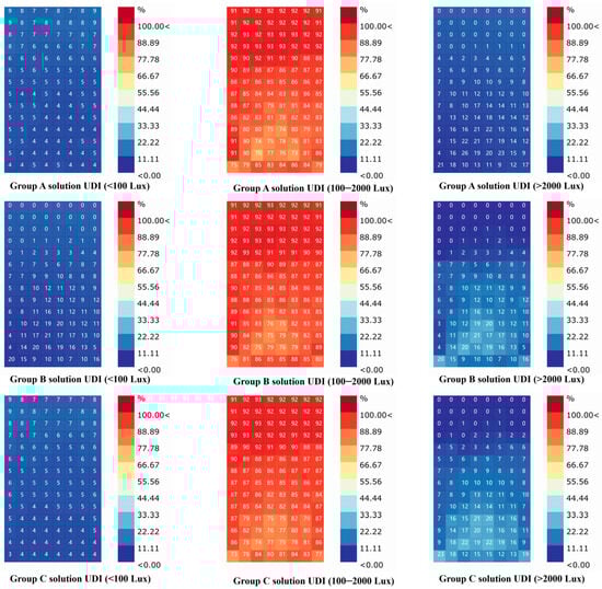 The primary indicators for evaluating indoor daylighting include the daylight factor (DF) [], daylight coefficient (DC) [], useful daylight illuminance (UDI) [], and daylight autonomy (DA) []. Since DF and DC are commonly used evaluation metrics for a static daylighting analysis, their use in a dynamic daylighting evaluation may lead to inaccurate calculations. Therefore, UDI is selected as the evaluation index for an indoor dynamic daylighting environment. UDI is divided into three evaluation levels based on the illuminance range: less than 100 Lux, 100–2000 Lux, and over 2000 Lux. The illuminance value between 100 Lux and 2000 Lux is indicated to ensure the demand for indoor daylighting while also avoiding the hazards of glare or overheating indoors caused by excessive sunlight. Honeybee utilized Daysim and Radiance tools to conduct an hour-by-hour daylighting simulation analysis throughout the year. The measurement grid size was set at 0.5 × 0.5 m, located at a height of 0.8 m above the office desktop, with a total of 112 daylighting test points. The reflectance (R) of the office building boundary materials is listed in Table 1 and Table 2 shows the radiance simulation accuracy settings.