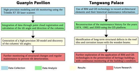 Despite achieving some results, this study has certain limitations: the unique nature of the study object may limit the applicability of the findings to other types of ancient buildings. The complexity of Guanyin Pavilion’s structure and its unique historical background required specialized methods and technologies that may not be easily transferable to simpler wooden buildings or those with different historical contexts. Future research should focus on adapting these advanced methods and technologies to be more universally applicable, especially for buildings with varying structural complexities. Developing more cost-effective data collection and processing methods, such as portable, low-cost 3D scanning devices and simplified software, could make these technologies more accessible to a wider range of sites. Additionally, integrating emerging technologies like artificial intelligence and machine learning could enhance the adaptability and efficiency of these methods, promoting the sustainable protection and utilization of a broader spectrum of ancient wooden structures.