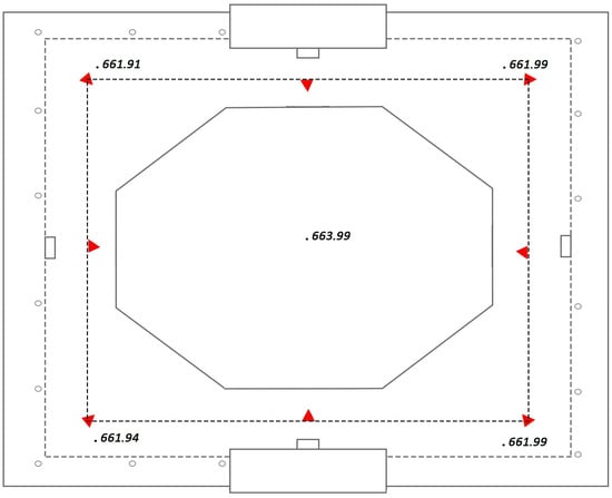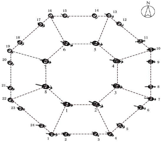 Due to the large size of the Guanyin Pavilion, this project uses GPS technology to establish three fixed reference points on its northern side. These points are then used for precise measurements with a total station involving closed-wire control measurements around the pavilion. In Figure 3, red triangles indicate the specific points used for control measurements. This study employed the China Geodetic Coordinate System 2000 (CGCS2000) to ensure precise measurements through satellite positioning and high-accuracy ground survey data.