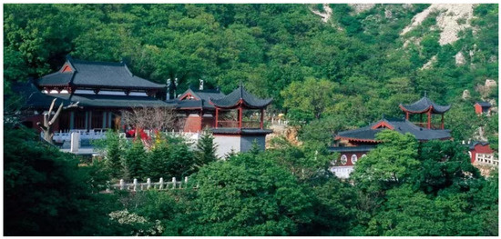 The Guanyin Pavilion, located in the Dahei Mountain Scenic Area in Jinzhou District, Dalian City, Liaoning Province, China, is a Buddhist structure of significant historical and cultural importance (Figure 2). The Guanyin Pavilion is characterized by a lofty roof ridge and gracefully extended eaves. The roof is adorned with greenish-grey tiles that harmonize with the natural environment.