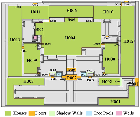 On the GIS platform, the core area of Tangwang Palace includes various surface elements such as 13 dwellings, 21 gates, three shadow walls, two tree pools, and one well. These elements serve to record the attribute information of the heritage buildings (Figure 7). Unlike conventional documentation methods, the elements in GIS have distinct numerical and nominal designations that correspond to the actual heritage structures. This helps reduce the confusion caused by the simultaneous use of numerous names. For example, the cluster consists of thirteen dwellings named H001 to H013 in sequential order.
