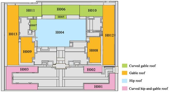 The essential data to be recorded for Tangwang Palace’s cultural treasures and buildings includes architectural structure, historical background, existing deterioration, and maintenance plans, among other aspects. This information can be recorded in a GIS and visually presented, with a level of detail comparable to architectural monoliths. In the core area of Tangwang Palace, there are four types of roof forms: hermitage, hard hill, scaffolding hard hill, and scaffolding hermitage. The distribution pattern of these roof forms is clear: the main palace features hermitage roofs, the secondary buildings on either side have hard hill roofs, the living area in the northern part has scaffolding hard hill roofs, and the ancillary rooms in the southern part have scaffolding hermitage roofs (Figure 8). The value of each building form, including the roof type, is recorded in GIS to facilitate retrieval for purposes such as monitoring, protection, management, research, and other uses related to cultural heritage and buildings.