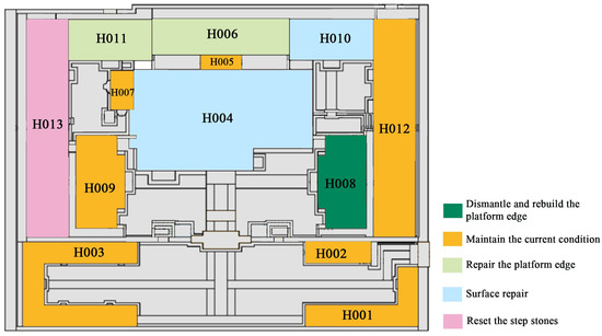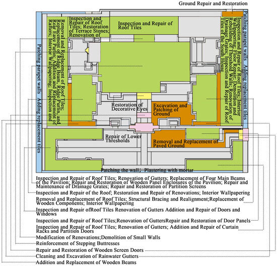 Tangwang Palace underwent maintenance three times: 1974, 1982, and 2000. The restoration efforts included exposing the tile roof, repairing the substantial wooden structures, fixing the ground, and refurbishing the oil decorations. In GISs, maintenance information is stored in a field corresponding to the year, with the building unit as the unit of measurement. This allows for the visualization of the maintenance status of a group of buildings in a specific year through drawings (Figure 9, Figure 10 and Figure 11) and the representation of a building unit’s maintenance status across all years through a data table. GIS enables the integration of space and time within a single platform [43].