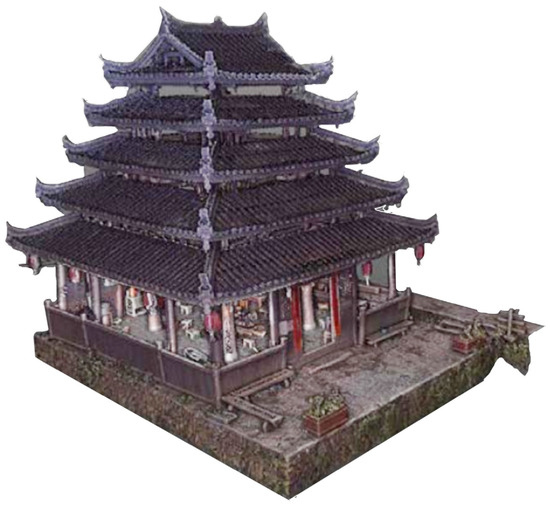 During the denoising process of the point cloud data for Guanyin Pavilion, we used Trimble RealWorks software (version 2024.10) to modify and segment the merged point cloud data. This was done to eliminate extraneous points outside the primary structure of the target building. As a prominent landmark in the Daheishan Mountain Scenic Area, Guanyin Pavilion experiences significant human activity and noise disturbances caused by climatic conditions. As shown in the Figure 15 and Figure 16, the denoising process significantly reduced irrelevant, aberrant, and isolated points.