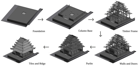 By importing the segmented point cloud data of Guanyin Pavilion into Autodesk Revit, a 3-dimensional information model can be generated. Constructing the 3D information model in Revit involves several steps, including creating elevation grids, designing family components, specifying materials, adjusting the model, and assembling the final structure (Figure 18). Each component’s position is calculated according to its corresponding location, while its dimensions are computed based on the point cloud data. After determining each component’s position and size, the family dimension parameters are established. Once each family element is completed, they are assembled to form the entire 3D construction model.