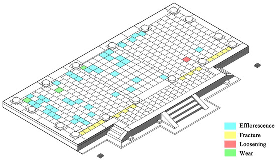 The BIM model is directly linked to the underlying data. The foreground model displays the geometric shape of the square tiles, while the database stores information such as name, number, category, condition, and maintenance measures. These attributes are interconnected and indexed, as shown in Figure 19 and Table 7. By comprehensively recording the information of each square tile without compromising visibility, effective handling of large data volumes is ensured. GIS primarily focuses on cluster-level monitoring, whereas BIM delves into monitoring at the individual component level.