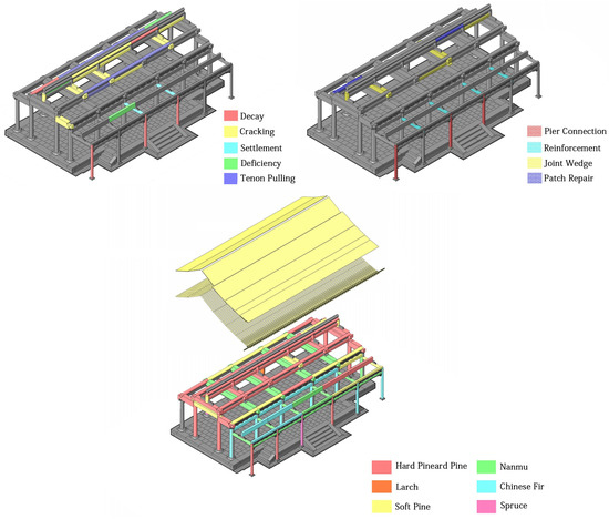 Additionally, numerous specialized assessments have been developed to address the current condition and decay of cultural heritage structures. These reports provide comprehensive information on timber buildings, tiled roofs, walls, and painted decorations. They include detailed assessments of defects and deterioration, as well as information on the tree species used for the timber (Figure 20). The design outcomes primarily focus on the intervention procedures for building components, including replacement, patching, and deconstruction. The data mentioned above exists in various formats, is managed by different methods, and has varying degrees of relevance.