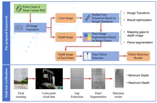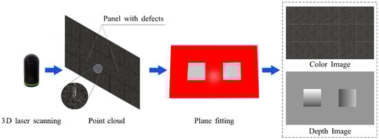 Based on the preceding analysis, this study proposes a novel method for detecting stone curtain wall panel defects using point cloud data. The methodology comprises several steps. First, a 3D laser scan of the stone curtain wall facade is conducted. The resulting point cloud is then transformed into a depth map. Leveraging the sealants between stone curtain wall panels, a computer vision approach is employed to segment individual panels. Subsequently, the presence of cracks and misalignments on panel surfaces is detected by incorporating the architectural façade design information. This process culminates in a comprehensive defect status assessment for each panel. The innovation of this research lies in its integration of point cloud data conversion to depth maps, computer vision techniques, and design information for defect detection on stone curtain wall panels. This method enables the efficient and thorough acquisition of stone curtain wall panel defect data while avoiding risky or destructive sampling tests thus providing a reliable reference for subsequent inspections.