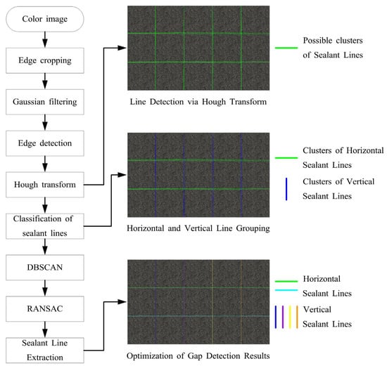 After detecting the sealant lines, we classify them into two categories based on their angles relative to the y-axis—horizontal (>45°) and vertical (≤45°). Then, these lines are grouped based on their positions along the y- and x-axes, as well as their relative densities, to identify clusters corresponding to sealant connections in the stone curtain wall. In this study, the Density-Based Spatial Clustering of Applications with Noise (DBSCAN) method for clustering was employed. This method was chosen for its ability to handle clusters of arbitrary shape and its robustness to noise, making it particularly suitable for grouping potentially imperfect line detections in complex architectural images. Subsequently, the RANSAC (Random Sample Consensus) algorithm is employed to fit lines to the different clusters. RANSAC’s strength lies in its ability to accurately fit models even in the presence of numerous outliers, making it ideal for our application where detected lines may be imperfect due to image noise or architectural complexities. This robustness ensures a more accurate representation of the true sealant lines, adapting to the varying quality of input data.