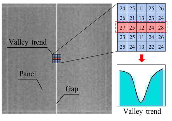 In this study, the linear positions corresponding to the stone curtain wall’s sealant lines, extracted from the color image, are mapped onto the depth image and designated as white. This mapping process can be executed directly due to the one-to-one pixel correspondence between the color and depth images, both derived from the same point cloud. Following the mapping, a kernel-based sealant line detection method is employed on the depth image to verify the line positions. This research assumes that the width of the sealant lines in the stone curtain wall is approximately constant. The verification process begins by calculating the coordinates of the intersection points between the lines. At non-intersection points, a series of points are randomly selected as centers to construct 5 × 5 kernels. The depth values of pixels within these kernels, oriented perpendicular to the line direction, are then extracted. The presence of a valley-like trend in these depth values is used to determine whether the current point belongs to a sealant line. The valley-like trend in depth values is indicative of a sealant line, suggesting a local minimum in depth that corresponds to the narrow sealant line between panels. This method is sensitive to the subtle depth variations that characterize sealant line locations. If more than 10% of the points are not identified as belonging to a sealant line, it necessitates a reevaluation of the color image through the steps outlined in Section 2.2 (Figure 4).