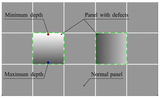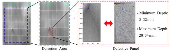where Dmax and Dmin represent the maximum and minimum pixel depth values within the panel region, respectively, Lglobal denotes the actual global maximum depth difference, and ΔLpanel signifies the maximum actual depth difference of the panel. The final output is a matrix that encapsulates the depth variation information for each grid region. The numerical positions within this matrix correspond directly to the positions of the panels in the image. The relevant results are overlaid onto the depth map, illustrating the image and depth analysis outcomes for specific grid regions (see Figure 5). This provides a visual tool that facilitates the evaluation and comparison of depth discrepancies across different regions. To further refine our analysis, the Interquartile Range (IQR) method is employed to identify outliers based on the matrix values. This method involves calculating the first (Q1) and third quartiles (Q3), followed by determining the IQR, which is defined as Q3 − Q1. The boundaries for outliers are then established as follows: the lower boundary is set at Q1 − 1.5 × IQR and the upper boundary is set at Q3 + 1.5 × IQR. Any values falling below the lower boundary or above the upper boundary are considered outliers. This statistical approach is effective in identifying anomalies that may indicate defects or irregularities in the stone curtain wall panels. By applying the IQR method, the depth values that deviate significantly from the majority can be systematically filtered out, which may correspond to areas of concern such as cracks, warping, or misalignments. The use of IQR not only helps in detecting outliers but also provides a robust measure of the spread of the data, allowing for a more nuanced understanding of the depth distribution within each panel.
