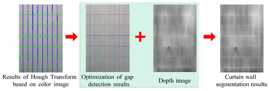 The defect detection method for stone curtain wall panels proposed in this study leverages the integration of three-dimensional laser scanning technology and sophisticated image processing algorithms to achieve an efficient and accurate detection of abnormalities. A key aspect of this methodology is the strategic application of the Hough Transform, which is initially employed in the color image rather than directly in the depth map. This approach is adopted due to the color image’s inherent advantage in providing rich texture and color information, which are critical for distinguishing the sealant lines from the panels. The sealant lines exhibit distinct color and texture characteristics that are markedly different from those of the surrounding panels, allowing the Hough Transform to more sensitively and accurately identify the straight-line-shaped sealant lines.