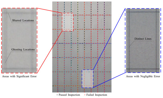In cases where the sealant line width does not exceed two pixels, different kernel sizes (3 × 3, 5 × 5, and 7 × 7) were tested and the 3 × 3 kernel was found to be more sensitive to local variations but also more susceptible to noise. The 7 × 7 kernel’s large range might introduce errors from the panels. Conversely, the 5 × 5 kernel offered a good balance between detail preservation and noise reduction. Furthermore, in the case of unqualified results, several scenarios may arise, i.e., if the unrecognized points are concentrated at one end of the sealant line, it indicates that the extracted sealant line is skewed; if the unrecognized points are clustered within the middle range of a particular panel, it suggests that there may be defects at the edges of that panel; and if the unrecognized points appear at various positions, it implies that the extracted sealant line is incorrect. This multi-faceted discussion helps to better understand the limitations and applicability of the kernel-based detection method.